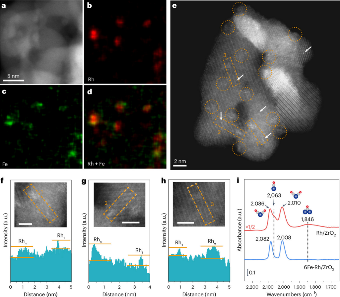 利用原子层沉积(ALD)技术将FeOx物种精准沉积到ZrO₂负载的二维Rh团簇表面,构筑了原子亲密的FeOx-Rh-ZrO₂双界面催化剂。球差校正透射电镜证实了选择性沉积的实现,揭示了两个不同界面具有原子尺度的亲密性(Nature Nanotechnology, 2025, 20, 255)