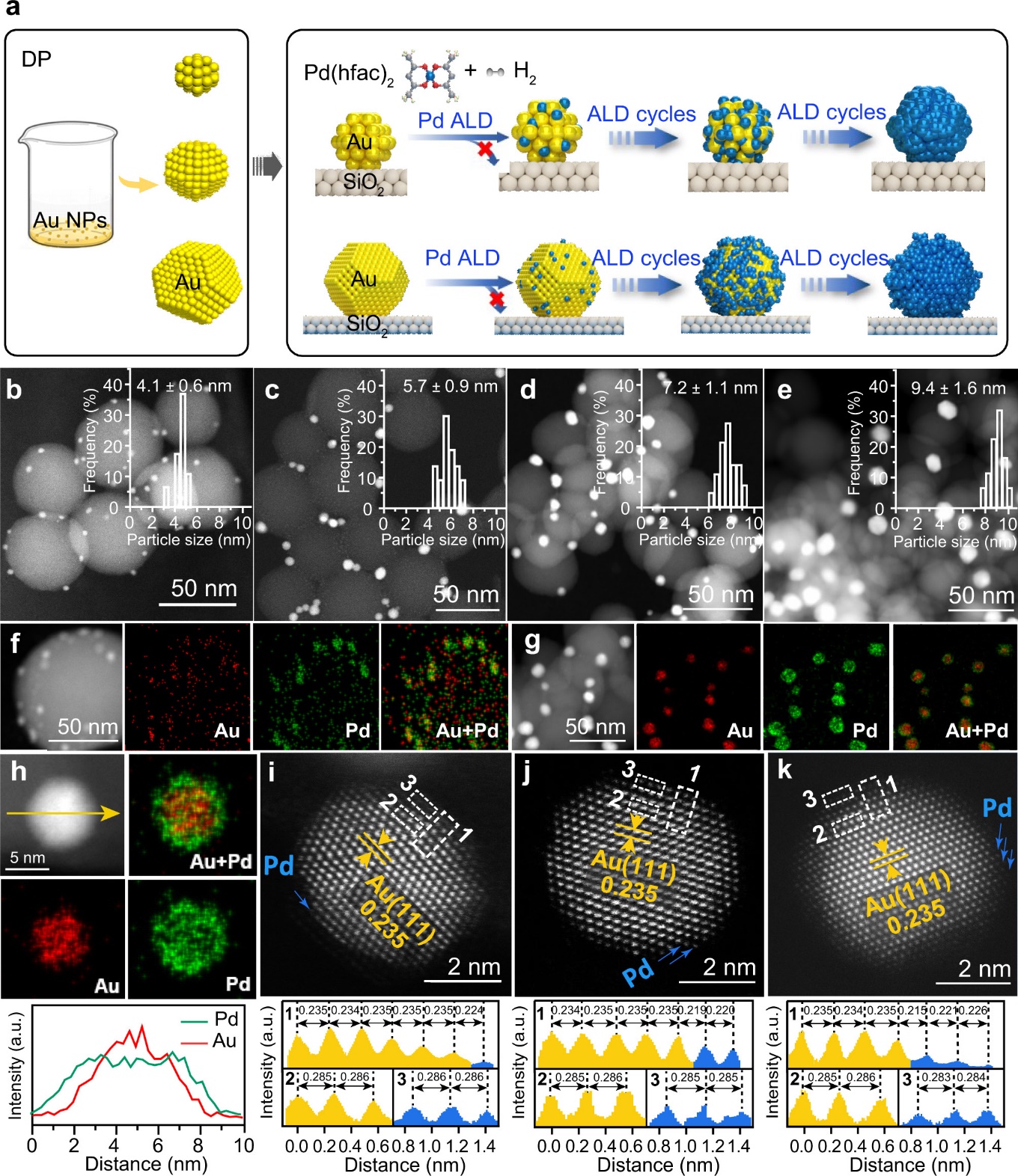 通过HAADF以及EDS分析证实了AuPd的核壳结构以及由于核壳晶面间距的不同导致的晶格扩张(Nature Communications,2023, 14530)