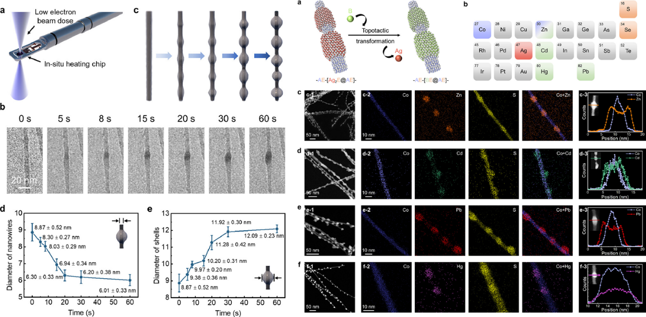 基于银基软晶格离子晶体中的弱原子相互作用以及高阳离子迁移率特性,有望实现离子键的动态断裂与重组,从而作为一种“软粘性固体”表现类似于传统流体的普拉托-瑞利不稳定性行为。这类银基软晶格材料极不耐电子辐照,在透射中捕捉这一自限制形貌演变过程非常具有挑战。利用冷场电镜的优势,结合原位加热样品杆,低剂量下,证实了这一现象(Journal of the American Chemical Society, 2024, 146, 33774-33783)