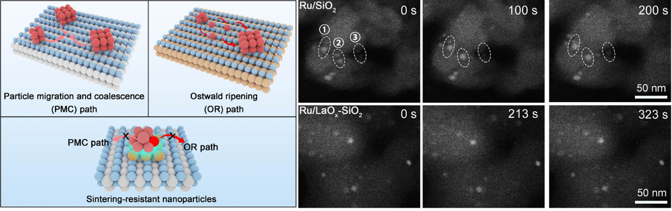 在催化剂载体与金属纳米颗粒之间嵌入一种均匀分布、小尺寸且互不相连的金属氧化物团簇,其因岛状结构被命名为“纳米岛”。相较于载体,纳米岛可实现对纳米颗粒更强的锚定作用,因此颗粒无法通过整体迁移(PMC)的路径烧结。利用原位气体加热样品杆,通过HAADF图像实时观察证实了这种机制(Nature Materials, 2025, 24, 891-899)